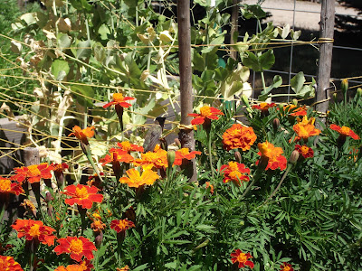 I went to my garden, to forage for lunch. As I walked up to one of the boxes, I was greeted by a humming bird. She was very friendly and came up to me. She's, probably, wondering where her feeder is, this year. Usually, they come up to me and squawk, that their feeder is almost empty or needs a little cleaning....soooo, demanding. I planted marigolds around my lettuce to keep out garden pest. This made a wonderful humming bird area. They nest in the tree, next to the garden.